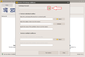 You will now open a window where you can set your restore of Exchange as you prefer. The first thing to do is add your Exchange account (compulsory with permission from an administrator!) so that Iperius has the necessary permissions to create the restore operation. To do so, just click on the icon shown in the image below.