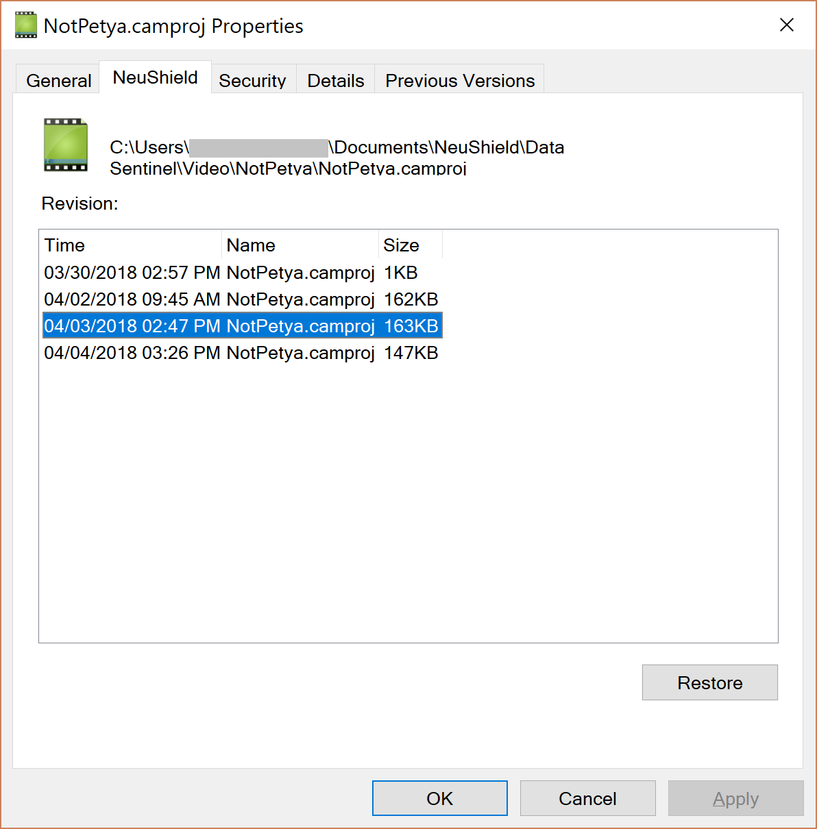 To restore a file open Windows Explorer and browse to the file you wish to restore. Right-click on the file and select ‘Properties’. Then open the ‘NeuShield’ tab, select the revision of the file you wish to restore and press ‘Restore’.